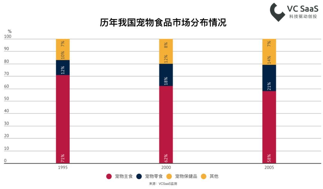 從1995年至2005年,我國寵物食品市場的消費(fèi)結(jié)構(gòu)已經(jīng)出現(xiàn)了明顯的改變。寵物食品的總體占比不斷下滑,寵物零食、寵物保健品的消費(fèi)比例不斷攀升,截止至2015年已分別提升至21%及14%。