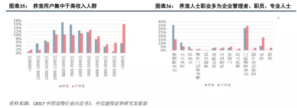 相比于不養(yǎng)寵用戶,養(yǎng)寵用戶集中于高收入人群。白皮書顯示,在養(yǎng)寵用戶中,月收入在8000-9999元占比最多,達到17%,而不養(yǎng)寵用戶在此收入?yún)^(qū)間占比為10.2%,收入在7000元以上的養(yǎng)寵用戶占總養(yǎng)寵用戶的58%,不養(yǎng)寵用戶在總不養(yǎng)寵用戶的40.%;從職業(yè)分布來看,養(yǎng)寵用戶相對于不養(yǎng)寵用戶也更多的集中于企業(yè)管理者、專業(yè)人士及普通職員,占比分別為35.3%、10.9%、30.9%;