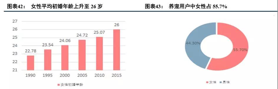 白領女性晚婚晚育,寵物成為陪伴。隨著我國經(jīng)濟水平發(fā)展、教育期限的增長和女性意識的覺醒,我國女性的初婚年齡不斷上升,平均初婚年齡已經(jīng)從1990年的22.78歲上升至26歲(2015年),隨之而來的是單身女性的陪伴需求不斷增長,寵物則可以部分滿足需求,寵物主人中女性占比較高,2017年為55.7%,她們更樂于為寵物消費