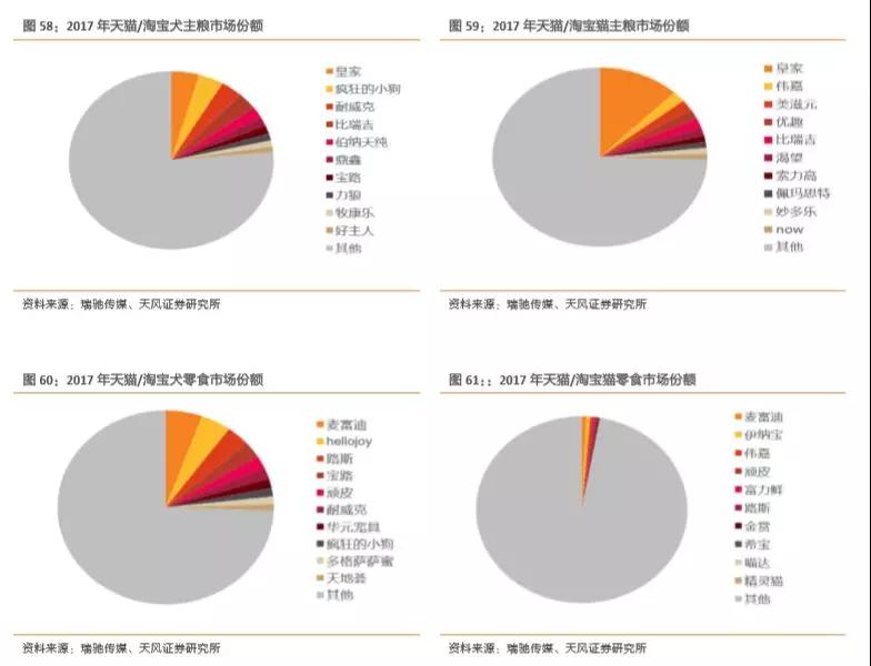 在寵物主食方面,2017年淘寶/天貓犬主糧銷售額67.36億元,貓主糧30.80億元,犬主糧CR10占比約23%,貓主糧CR10占比約25%?;始翌I(lǐng)先明顯,在犬貓主糧分別占比4.4%和12.2%,均為品牌第一。