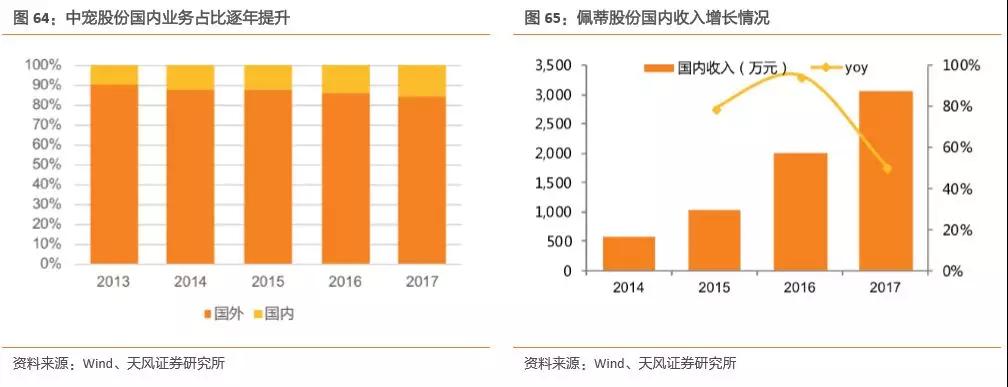 佩蒂股份入股寵物電商平臺(tái),同時(shí)開拓線下渠道,國(guó)內(nèi)收入2014-2017年復(fù)合增速達(dá)到74.3%。2017年中寵股份國(guó)內(nèi)業(yè)務(wù)占比上升至15.47%,佩蒂股份國(guó)內(nèi)業(yè)務(wù)占比上升至4.75%。