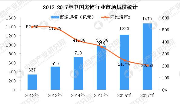 隨著寵物市場誕生后人們飼養(yǎng)寵物觀念的逐漸普及,中國寵物行業(yè)經(jīng)過二十多年的發(fā)展已逐漸形成規(guī)模。2012-2017年我國寵物行業(yè)市場規(guī)模不斷擴(kuò)大,年均復(fù)合增長達(dá)到34.26%,增長十分迅速。據(jù)統(tǒng)計2017年中國寵物行業(yè)市場規(guī)模達(dá)到1470億元,同比增長20.5%。盡管近年來我國寵物行業(yè)市場規(guī)模增速有所放緩,但仍然能保持高于20%的增速。