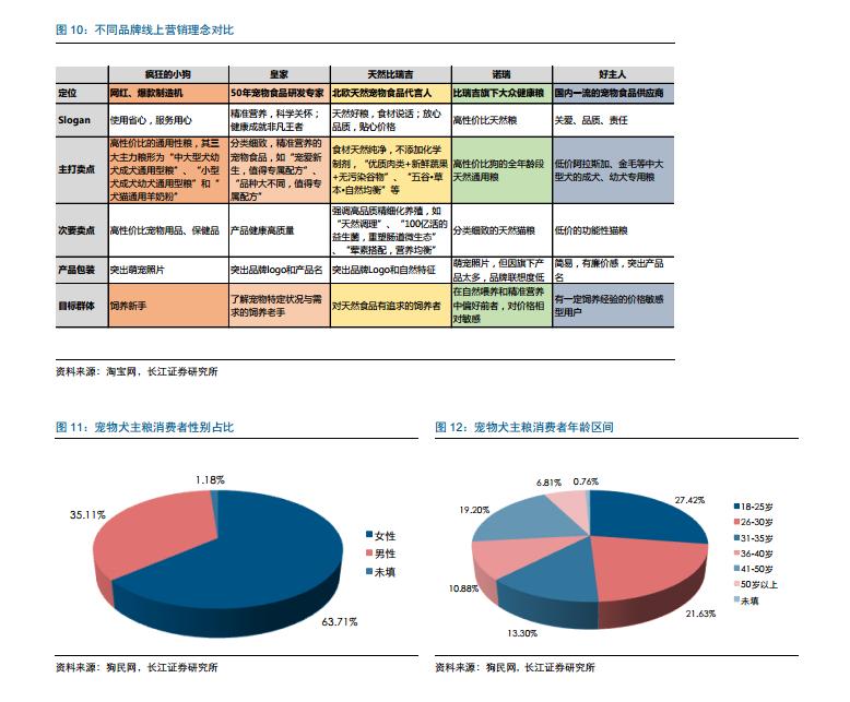 從淘寶上主要品牌主糧的產(chǎn)品價(jià)格來看,外資 品牌的產(chǎn)品價(jià)格普遍較高,集中在 50 元/kg 以上,這和品牌的產(chǎn)品定位密切相關(guān),而瘋 狂的小狗等國產(chǎn)品牌則更多的強(qiáng)調(diào)產(chǎn)品的性價(jià)比,通過打造網(wǎng)絡(luò)爆款產(chǎn)品來吸引消費(fèi)者 的購買。分析線上渠道消費(fèi)人群的年齡結(jié)構(gòu)來看,80 和 90 后是線上消費(fèi)的主力群體, 62%的消費(fèi)者年齡集中在 35 歲以下,因此對(duì)于寵物食品企業(yè)而言,如何打造品牌的特 色來吸引年輕消費(fèi)者是產(chǎn)品定位中需要解決的問題。隨著生活節(jié)奏的加快,年輕人對(duì)線 上渠道的依賴程度有望進(jìn)一步加強(qiáng),而充分利用線上渠道進(jìn)行全方位營銷將是開拓國內(nèi) 寵物食品市場的重要方式。