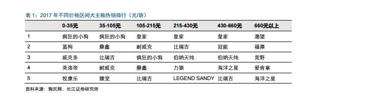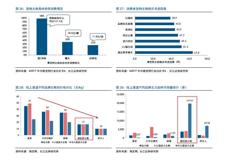 從 2017 年淘寶不同價格區(qū)間犬主糧熱銷排 行可以看出,瘋狂的小狗在 100 元以下的價格區(qū)間銷量穩(wěn)居第一,尤其是公司中大型成 犬主糧是著名的網紅品牌,單月銷量在眾多品牌中遙遙領先。進一步分析消費者購買主 糧的主要考慮因素,滿足營養(yǎng)需求是最主要的考量因素,而品牌知名度高低并不是決定 因素。