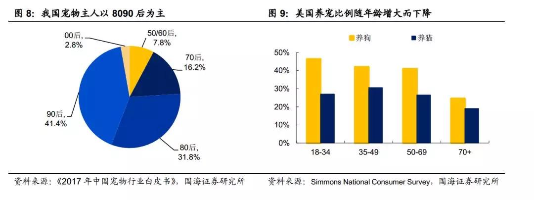根據(jù)《2017 年中國寵物行業(yè)白皮書》顯示,我國 80%的寵物主人均為 80、90 后。而美國寵物市場的數(shù)據(jù)也進(jìn)一步印證了我們的觀點(diǎn)——飼養(yǎng)寵物比例隨著年齡增加反而減少,尤其當(dāng)年齡超過 50 歲后,飼養(yǎng)比例下降尤為明顯。我們認(rèn)為這主要與年齡增大后體力精力下降有關(guān),事實(shí)上 40 歲前更容易形成養(yǎng)寵習(xí)慣。