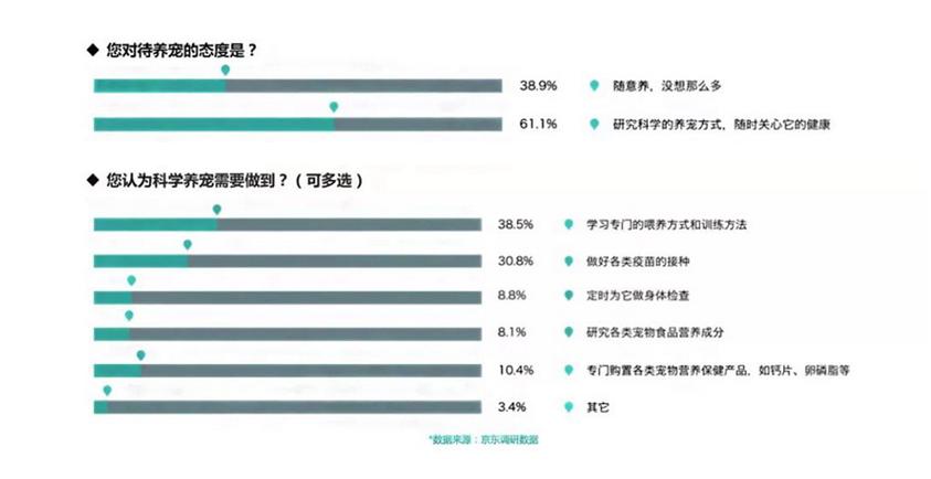 從調(diào)研數(shù)據(jù)及寵物用品消費(fèi)數(shù)據(jù)看,鳥(niǎo)類(lèi)/昆蟲(chóng)用品的銷(xiāo)售金額同比增幅就達(dá)到179%,倉(cāng)鼠、兩棲、兔子用品等消費(fèi)金額也都達(dá)到90%左右。此外,報(bào)告顯示,超過(guò)60%的消費(fèi)者會(huì)選擇研究科學(xué)的養(yǎng)寵方式,隨時(shí)關(guān)注它們的寵物健康;接近40%的消費(fèi)者會(huì)學(xué)習(xí)專(zhuān)門(mén)的喂養(yǎng)方式和訓(xùn)練方式;30.8%的消費(fèi)者會(huì)給愛(ài)寵做好各類(lèi)疫苗的接種……