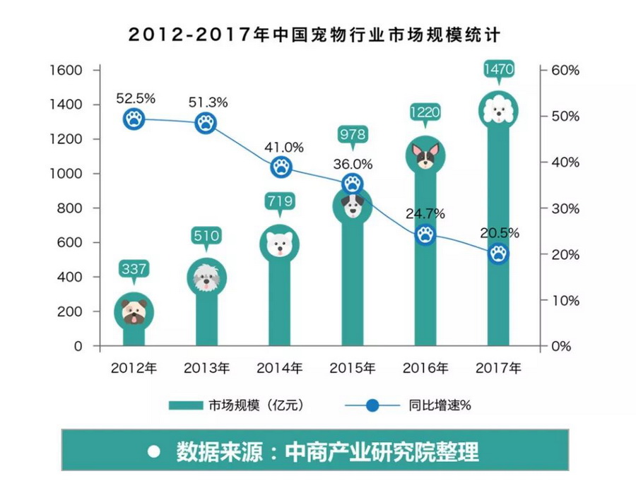 有關(guān)數(shù)據(jù)顯示,中國(guó)寵物狗的數(shù)量已經(jīng)達(dá)到2740萬(wàn)只,城鎮(zhèn)平均養(yǎng)寵率約為11%,為世界前三的“養(yǎng)寵大國(guó)”。2017年中國(guó)寵物市場(chǎng)規(guī)模達(dá)已經(jīng)到了1470億元,預(yù)計(jì)到2018年其市場(chǎng)規(guī)??梢赃_(dá)到1678億元,而且在未來(lái)3-5年內(nèi),寵物行業(yè)將繼續(xù)維持20%以上的高增長(zhǎng)。