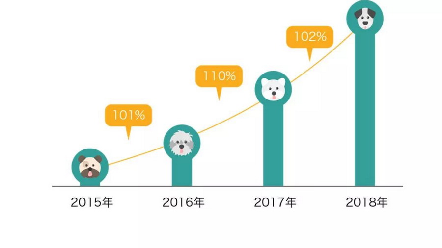 隨著國(guó)內(nèi)寵物經(jīng)濟(jì)消費(fèi)升級(jí)的推進(jìn),消費(fèi)者對(duì)高品質(zhì)線(xiàn)上寵物消費(fèi)方式的接受程度越來(lái)越高。京東大數(shù)據(jù)顯示,2015年-2018年京東平臺(tái)上,寵物消費(fèi)始終保持著100%以上的增長(zhǎng),且有不斷平穩(wěn)上升的趨勢(shì)。
