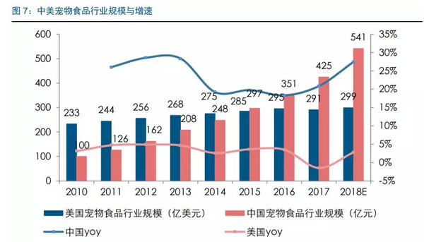 對比中美寵物市場規(guī)模與老齡化關系的圖像可以看出,雖然兩國的寵物食品和整體寵物產(chǎn)業(yè)規(guī)模都與老齡化程度成正向關系,但美國2001年以來,寵物產(chǎn)業(yè)與寵物食品市場的年復合增速在4%左右,和老齡化增速(1.5%)相差不大。