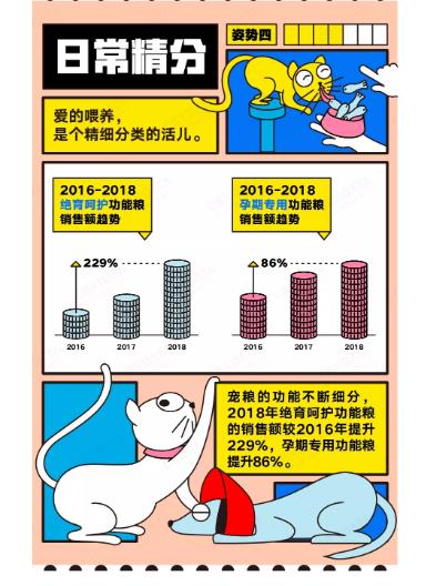 寵糧功能不斷細(xì)分,如針對(duì)絕育和孕期特殊護(hù)理需求的功能寵糧出現(xiàn),且得到消費(fèi)者的廣泛認(rèn)可。2018年絕育呵護(hù)功能糧銷售額較2016年提升229%,孕期專用功能糧銷售額較2016年提升86%。其中,以功能寵糧代表品牌冠能為例,在進(jìn)駐天貓平臺(tái)后,線上銷售規(guī)模呈爆發(fā)式增長(zhǎng)。