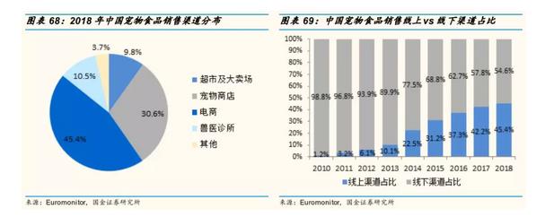 國金證券指出,從渠道分布來看,電商和寵物商店已經(jīng)成為中國寵物食品銷售占比最大的兩個(gè)渠道。