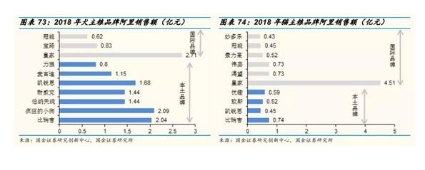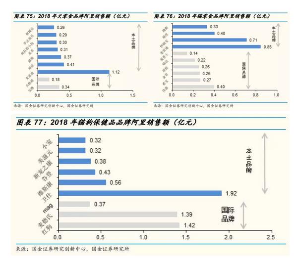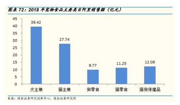 根據(jù)國金證券跟蹤的阿里(天貓+淘寶)銷售數(shù)據(jù),2018年犬主糧、貓主糧、狗零食、貓零食和貓狗保健品在阿里全網(wǎng)的銷售額分別為39.42億元、27.74億元、9.77億元、11.25億元和12.09億元。主食依舊是線上銷售的主力品類,但是零食和保健品的銷售勢頭也日益迅猛。