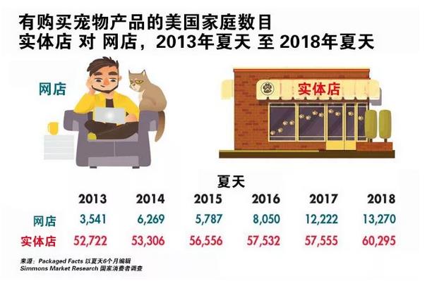 隨著寵物市場電子商務(wù)的快速增長,據(jù)Simmons全國消費者調(diào)查顯示,網(wǎng)購寵物產(chǎn)品的家庭數(shù)量從2013年夏季的350萬增加到2018年夏季的1,330萬。此外,從2016年夏季至2018年夏季,網(wǎng)購寵物產(chǎn)品的家庭數(shù)量增長了520萬,而從任何類型的零售店購物的家庭增加了280萬個。