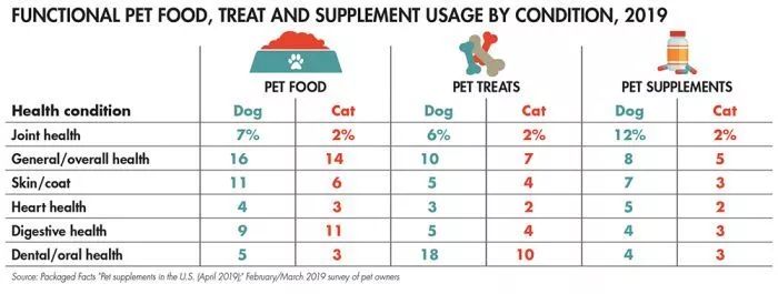 在美國(guó),當(dāng)涉及到關(guān)節(jié)健康時(shí),狗主人傾向于首先尋求補(bǔ)充劑,但是當(dāng)涉及到一般健康問(wèn)題時(shí),功能性主糧和零食是寵主的首選。