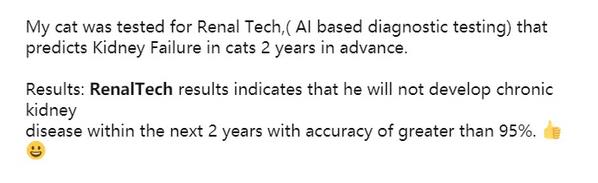 Twitter上已經(jīng)有獸醫(yī)表示帶自己的貓去做了RenalTech預(yù)測,結(jié)果是未來2年內(nèi)自家貓有95%以上概率不會(huì)患