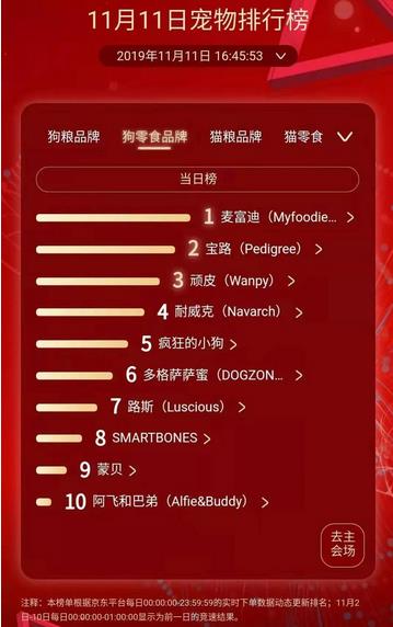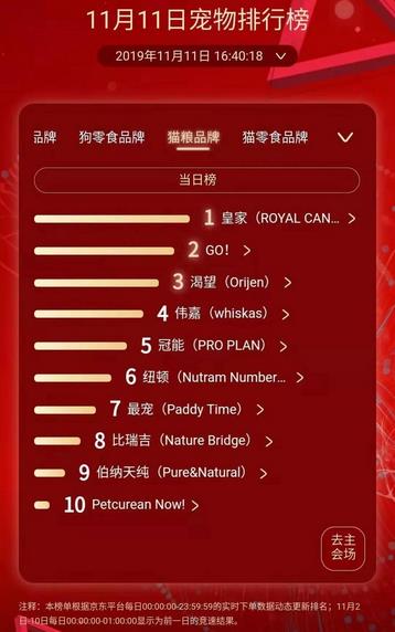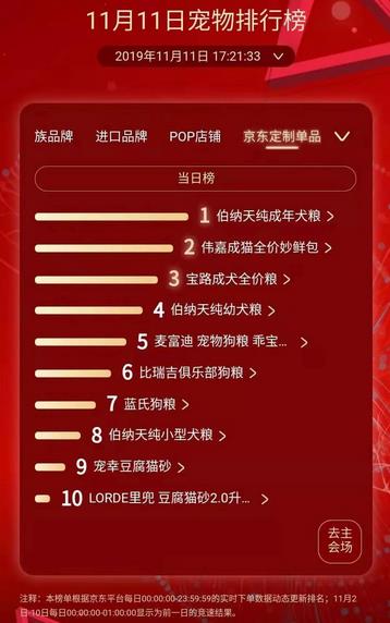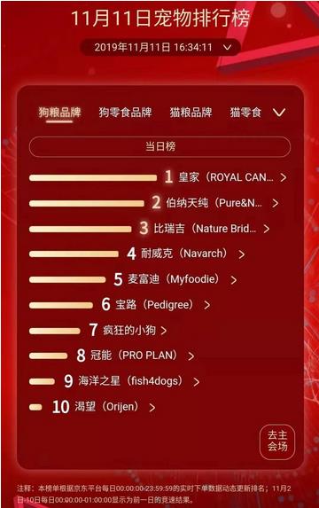 與11月1日相比,前三名仍為皇家、伯納天純以及比瑞吉,但皇家超越伯納天純排行成為狗糧品牌銷量第一,渴望做為新入圍榜單的品牌排行第十。