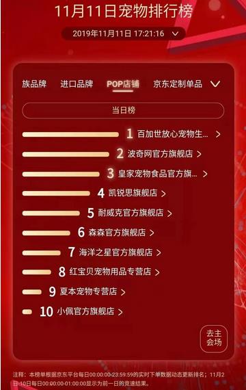 在POP店鋪排行榜中,排名前十的分別為百加世放心寵物生活官方旗艦店、波奇網(wǎng)官方旗艦店、皇家寵物食品官方旗艦店、凱銳思旗艦店、耐威克官方旗艦店、森森官方旗艦店、海洋之星官方旗艦店、紅寶貝寵物用品專營店、夏本寵物專營店以及小佩官方旗艦店。