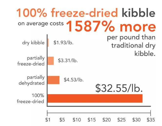 很多受歡迎的新類(lèi)型寵物食品甫一面世便價(jià)格高企,如風(fēng)干或凍干,對(duì)很多品牌來(lái)說(shuō)是頗具吸引力的擴(kuò)展方向。根據(jù)《Package Facts》的數(shù)據(jù),采用100%凍干的寵物食品平均價(jià)格比傳統(tǒng)膨化糧高1,587%,其中,采用100%凍干的寵物食品平均成本為每磅32.55美元,而膨化糧平均為每磅1.93美元。