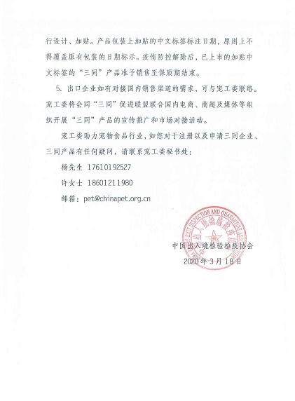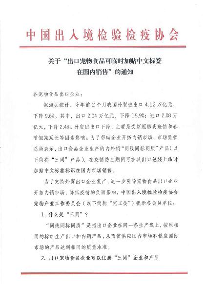 3月19日,中國出入境檢驗檢疫協(xié)會發(fā)布了關(guān)于《出口寵物食品可臨時加貼中文標(biāo)簽在國內(nèi)銷售》的通知。通知強調(diào),出口食品企業(yè)生產(chǎn)的內(nèi)外銷“同線同標(biāo)同質(zhì)”產(chǎn)品,在疫情防控期間可在其出口包裝上臨時貼中文標(biāo)簽標(biāo)識在國內(nèi)銷售。