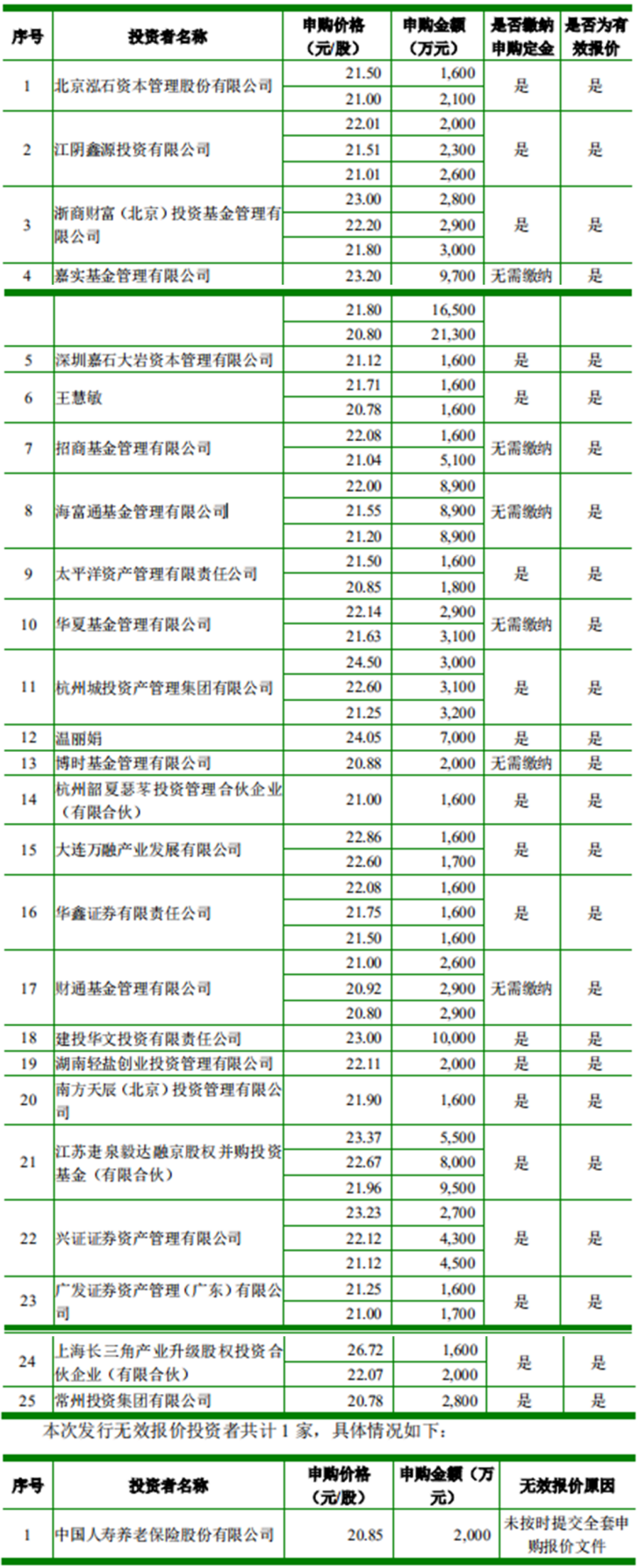 同時(shí),佩蒂還公布了26家投資者回復(fù)的《申購報(bào)價(jià)單》,其中包含25家有效報(bào)價(jià),1家無效報(bào)價(jià),有效報(bào)價(jià)區(qū)間為20.78-26.72元/股,有效報(bào)價(jià)具體情況如下: