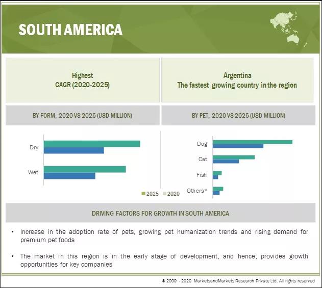 同時(shí),預(yù)計(jì)南美洲將在預(yù)測(cè)期內(nèi)見(jiàn)證市場(chǎng)的最高增長(zhǎng)。南美,其次是亞太地區(qū),預(yù)計(jì)從2020年到2025年將以高速增長(zhǎng)。巴西和阿根廷是南美地區(qū)最主要的市場(chǎng)。該地區(qū)的市場(chǎng)處于發(fā)展初期,因此為關(guān)鍵公司提供了增長(zhǎng)機(jī)會(huì)。預(yù)計(jì)南美地區(qū)在寵物食品配料市場(chǎng)中將以高速增長(zhǎng),因?yàn)樵摰貐^(qū)的一些國(guó)家為寵物食品行業(yè)提供了有利可圖的增長(zhǎng)機(jī)會(huì)。巴西是最大的寵物食品原料市場(chǎng),也是南美新興市場(chǎng)之一。