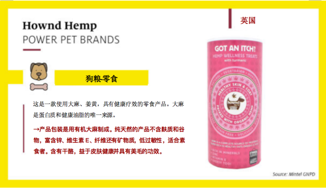 寵物主人對(duì)清潔標(biāo)簽的期望已經(jīng)從“安全”和“天然”演變?yōu)橐螳@得原料來源和加工信息。如下圖的案例,德國(guó)品牌Tjure,推出了和本土知名肉店合作的貓糧產(chǎn)品,宣稱產(chǎn)品的牛肉是來自于知名肉店“KLASSEN”里供應(yīng)的牛排,有效得到了人類食品供應(yīng)商的背書。另外還有英國(guó)Hownd Hemp推出的大麻二酚狗零食,不僅宣稱大麻是產(chǎn)品里的油脂和蛋白質(zhì)的單一來源,而且產(chǎn)品包裝是用有機(jī)大麻制成,天然又環(huán)保。