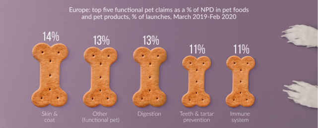 寵物食品品牌為了回應(yīng)寵物主人希望寵物健康且長(zhǎng)壽的需求,開發(fā)了各種有益于健康的功能宣稱的主糧和零食。這些健康功能通常與時(shí)下流行的原料相關(guān),比如治療焦慮和緩解疼痛的大麻二酚(CBD)、有益于平衡腸道菌群的益生菌和增加認(rèn)知功能的DHA。根據(jù)Mintel GNPD的數(shù)據(jù)顯示,從2019年3月到2020年2月,歐洲有72%的寵物食品和用品的新品具有功能型宣稱(例如免疫系統(tǒng)、關(guān)節(jié)和肌肉、神經(jīng)系統(tǒng))。