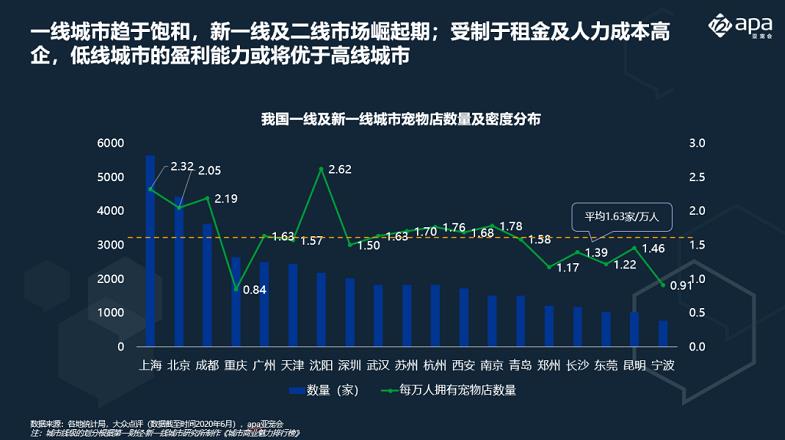 根據(jù)大眾點(diǎn)評(píng)搜索數(shù)據(jù)顯示,我國(guó)19個(gè)一線及新一線城市寵物店共有40,951家。上海、北京、成都、重慶位列前四。從人口密度分析,新一線及二線市場(chǎng)更具發(fā)展?jié)摿Α?/span>