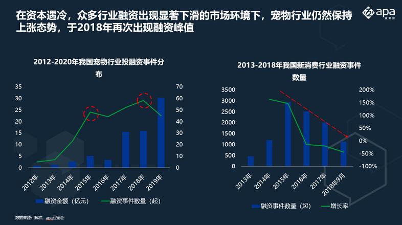 # 在資本遇冷,眾多行業(yè)融資出現(xiàn)顯著下滑的市場(chǎng)環(huán)境下,寵物行業(yè)仍然保持上漲態(tài)勢(shì),于2018年再次出現(xiàn)融資峰值;具有高復(fù)購(gòu)率、高客單價(jià)、高質(zhì)量體驗(yàn)特征的賽道資本關(guān)注度高。