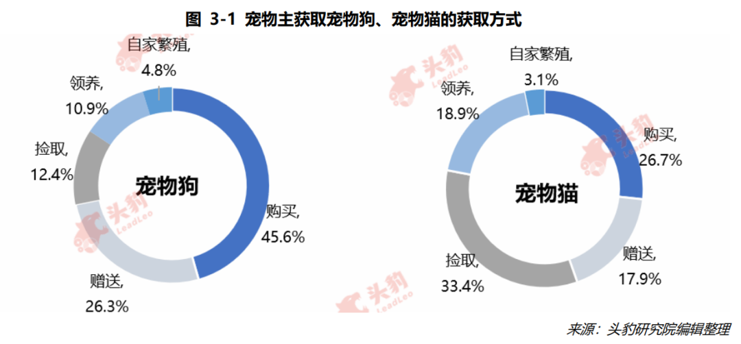 據(jù)調(diào)查,僅有45.6%的養(yǎng)狗寵物主、26.7%的養(yǎng)貓寵物主通過購買的方式獲得寵物活體。超過50%的寵物主依舊通過非購買的方式獲得寵物,其中,12.4%的養(yǎng)狗寵物主和33.4%的養(yǎng)貓寵物主通過撿取流浪動(dòng)物的方式獲取寵物。中國的流浪動(dòng)物眾多,但流浪動(dòng)物未經(jīng)過檢疫,存在健康風(fēng)險(xiǎn),且性情不一定適合飼養(yǎng)。專業(yè)寵物養(yǎng)殖商飼養(yǎng)的寵物經(jīng)過檢疫環(huán)節(jié),更加干凈健康,且幼寵經(jīng)過寵物養(yǎng)殖商的訓(xùn)練,更加溫順,適合飼養(yǎng)。