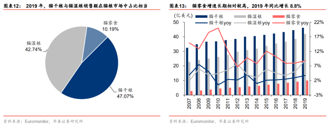 貓干糧與濕糧規(guī)模接近,貓零食增速最快