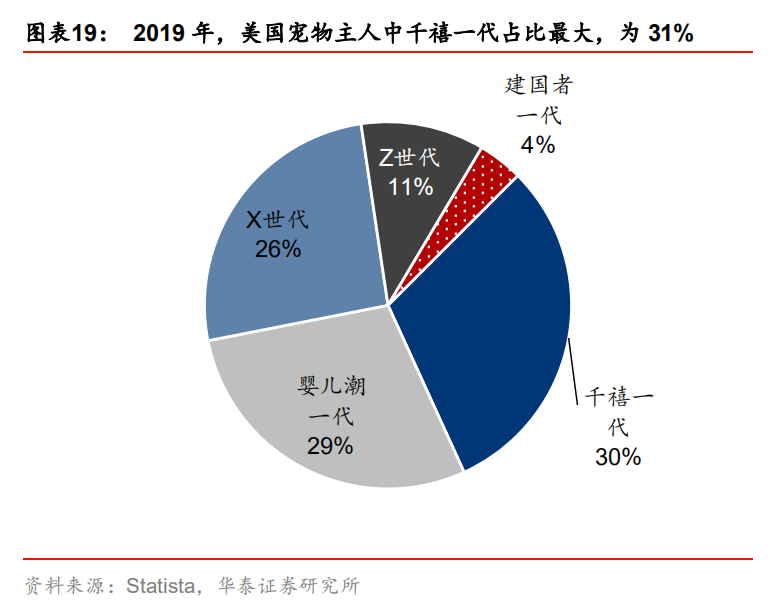 根據(jù)APPA統(tǒng)計,2019年美國約8490萬家庭擁有寵物,,占全國家庭總數(shù)(2019年美國家庭總量約為1.27億)的67%,其中養(yǎng)狗家庭和養(yǎng)貓家庭占絕大多數(shù),分別為6340萬、4270萬。由此可以推算,2019年美國有2120萬“貓狗雙全”家庭。