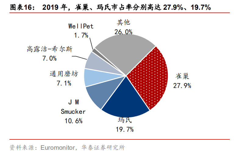 市場集中度高,各類細分市場都存在優(yōu)勢明顯的龍頭品牌,小企業(yè)突圍難度大。美國寵物食品行業(yè)發(fā)展起步早,雀巢、瑪氏等食品生產(chǎn)巨頭入場時間早,并在長期發(fā)展中通過多次外延并購擴展產(chǎn)品線、提高市占率。2019年雀巢、瑪氏為美國寵物食品行業(yè)市占率排名前二,分別為27.9%、19.7%,兩家公司的市場份額總和已經(jīng)高達整個市場的近一半。