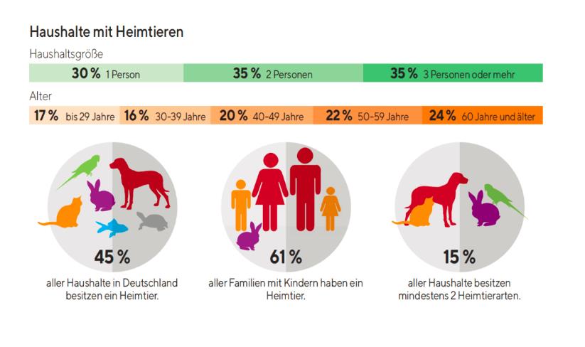 有45%的德國(guó)家庭在養(yǎng)寵寵物,其中在有小孩的家庭中,有61%養(yǎng)寵物。大多數(shù)寵物生活在多人家庭中,兩人、三人或三人以上家庭的養(yǎng)寵比例為35%,而單身家庭的養(yǎng)寵比例為33%。